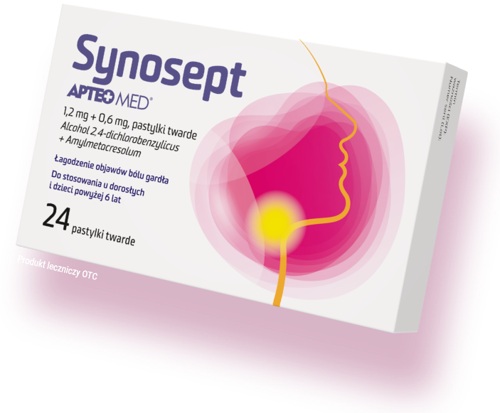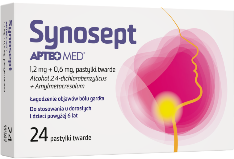 Zawiera alkohol 2,4-dichlorobenzylowy i amylometakrezol, które: